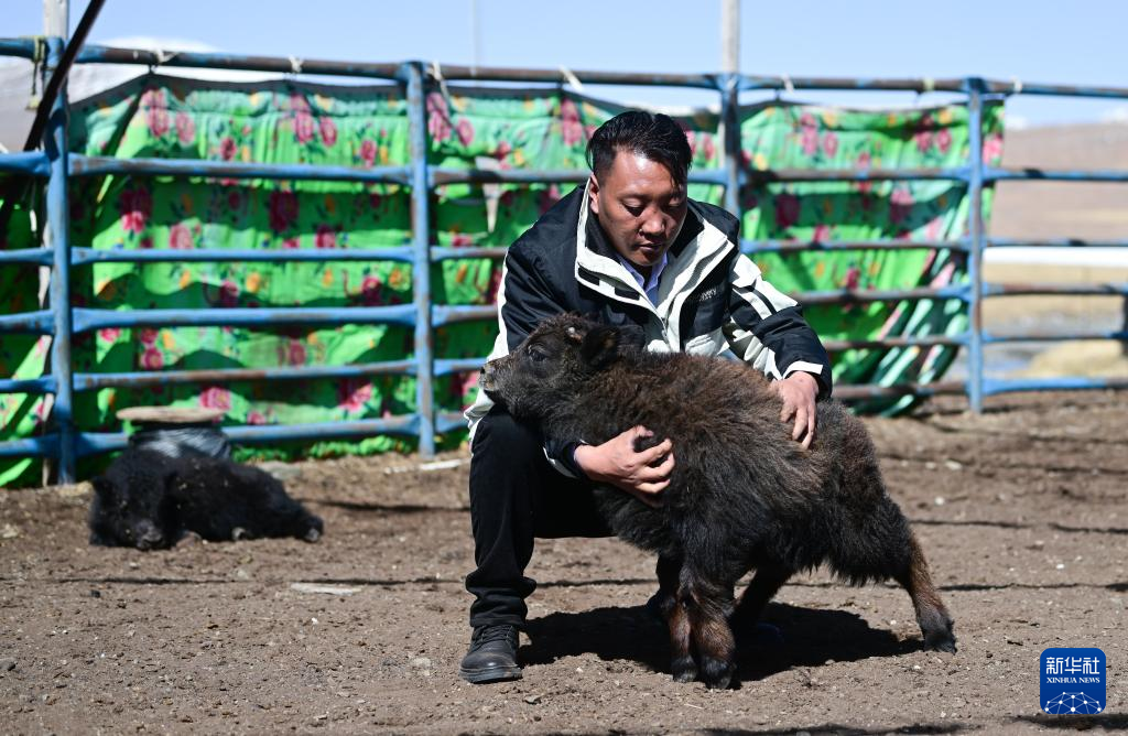 4月20日,在青海省玉樹(shù)藏族自治州曲麻萊縣,牧民在查看牛犢生長(zhǎng)情況。