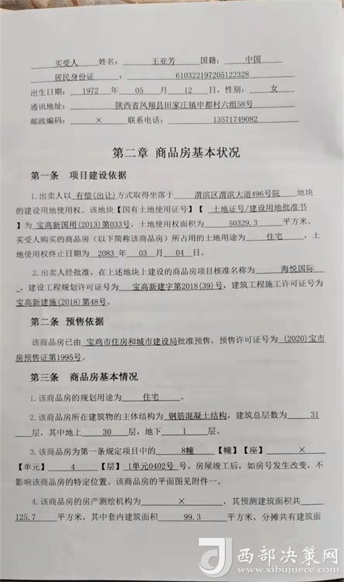 決策熱線|寶雞市民王女士(化名):我于2021年3月在寶雞市高新區(qū)渭濱大道臻和天下看了一套住宅樓,覺(jué)得地段位置也好。經(jīng)過(guò)和家人一起商議,與售樓人員確定了8幢1單元4層?xùn)|戶南北通透的房子,于2021年3月18日簽訂書面商品房買賣合同,于2021年4月15日簽訂按揭貸款合同給開(kāi)發(fā)商交清了房款,前期共花費(fèi)七十余萬(wàn)。
