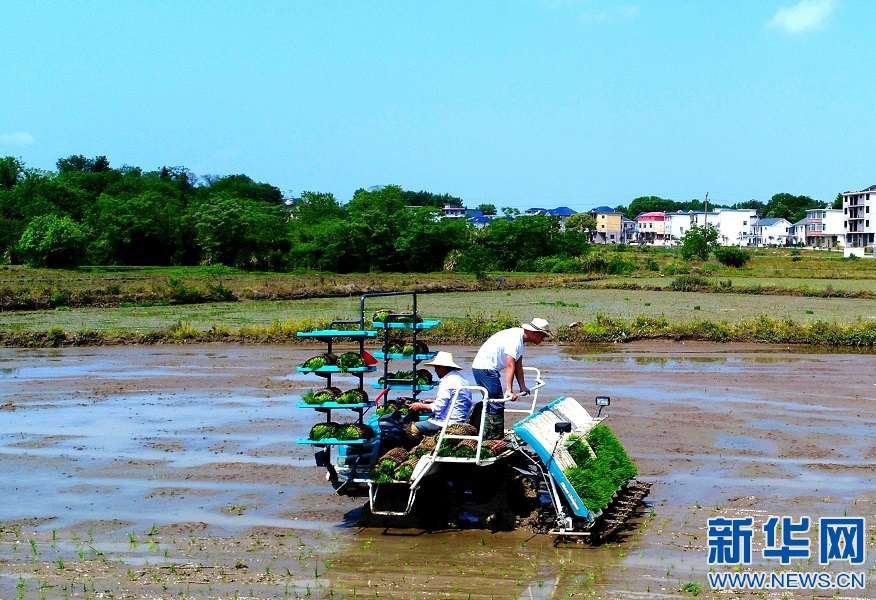在江西省湖口縣新豐村的連片稻田里,周益和父親周愛霞正駕駛農(nóng)機(jī)來回穿梭。新華網(wǎng)發(fā) 徐會(huì)剛 攝