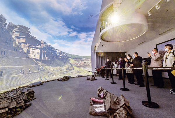 圖為在重慶紅巖革命紀(jì)念館“紅巖記憶”數(shù)字體驗(yàn)廳內(nèi),觀眾們觀看以雙曲三維穹幕技術(shù)展示的場(chǎng)景。 新華社記者 李賀/攝