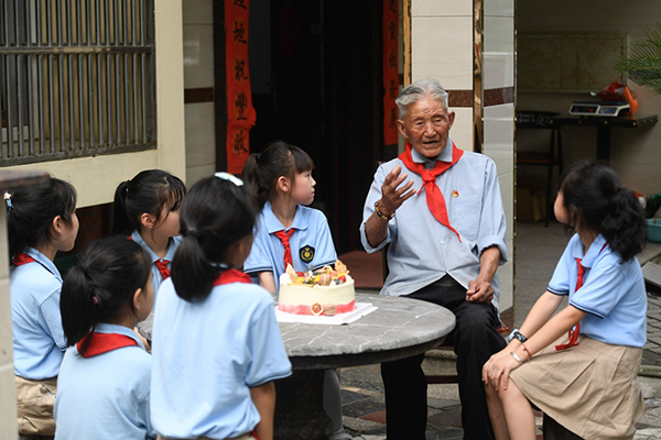 2020年6月28日,浙江省湖州市吳興區(qū)八里店鎮(zhèn)組織小學(xué)生開展“童心向黨”主題繪畫、聆聽老黨員講故事、參觀紅色教育基地等活動(dòng)。圖為吳興區(qū)第一小學(xué)學(xué)生聆聽八里店鎮(zhèn)前村村老黨員陳金茂(右二)講故事。新華社記者 黃宗治/攝