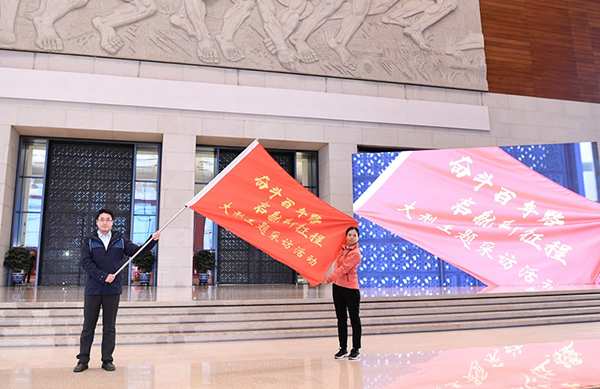 2021年1月18日,在北京國(guó)家博物館,記者代表展示“奮斗百年路 啟航新征程”大型主題采訪活動(dòng)旗幟。新華社記者 申宏/攝