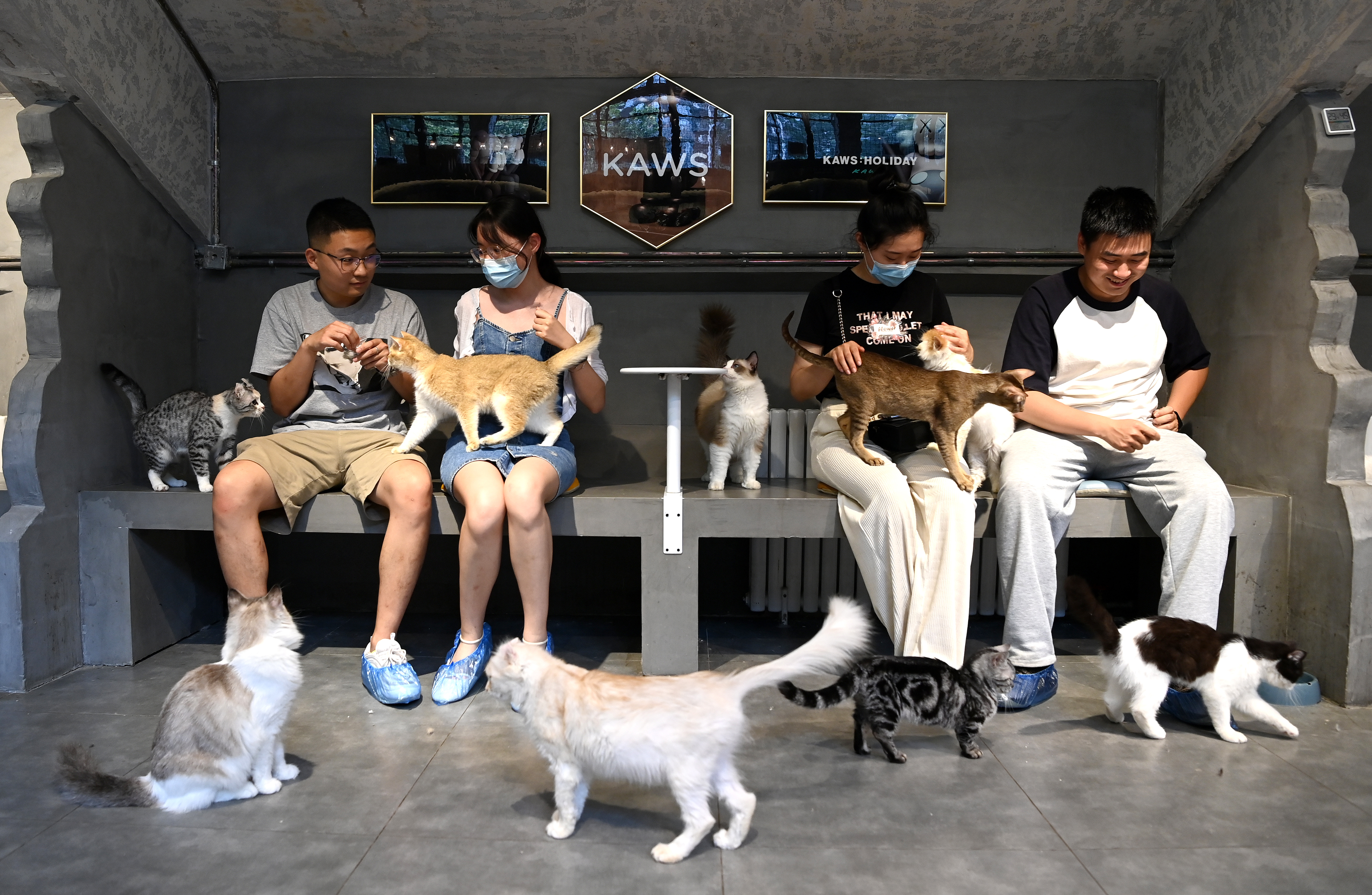 市民在西安際華3511文創(chuàng)科技園內(nèi)的貓咖逗貓(5月20日攝)。 新華社記者 劉瀟 攝