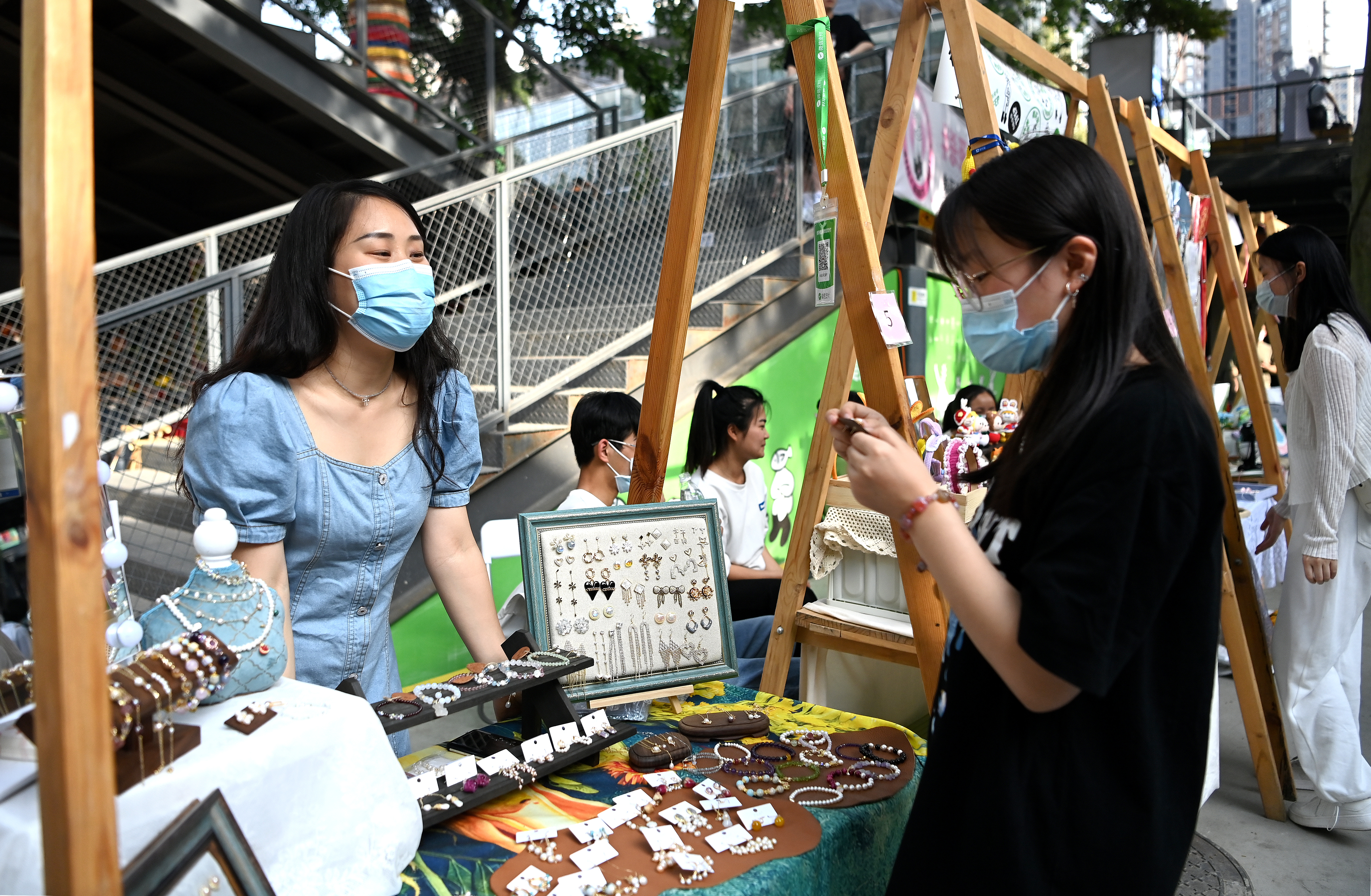 市民在西安際華3511文創(chuàng)科技園內(nèi)的市集上挑選飾品(5月20日攝)。 新華社記者 劉瀟 攝