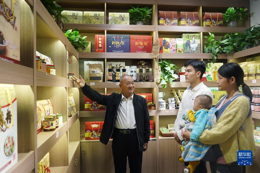 2020年10月21日,江西省贛州市于都縣梓山鎮(zhèn)潭頭村村民孫觀發(fā)(左一)向游客介紹當(dāng)?shù)氐奶厣r(nóng)產(chǎn)品。 新華社記者 萬象 攝