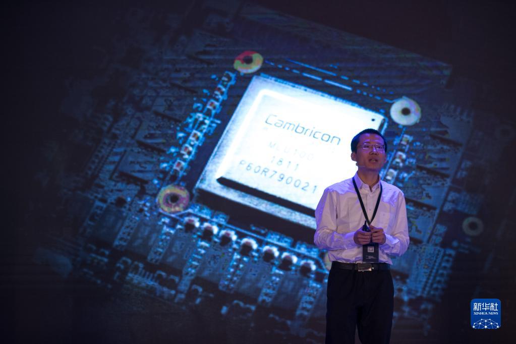在上海國際會(huì)議中心舉行的發(fā)布會(huì)上,寒武紀(jì)科技公司首席執(zhí)行官陳天石介紹國內(nèi)首款云端人工智能芯片(2018年5月3日攝)。新華社記者 金立旺 攝