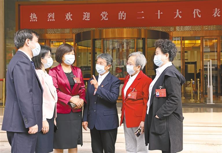 十月十四日,出席黨的二十大的陜西代表王友民、何菲、常亞瓊、張蓮蓮、路生梅、王照輝(左起)在住地交流履職感想。代表們一致表示,將堅(jiān)決扛起政治責(zé)任,以飽滿(mǎn)的熱情認(rèn)真履行好神圣職責(zé)。 記者 母家亮攝