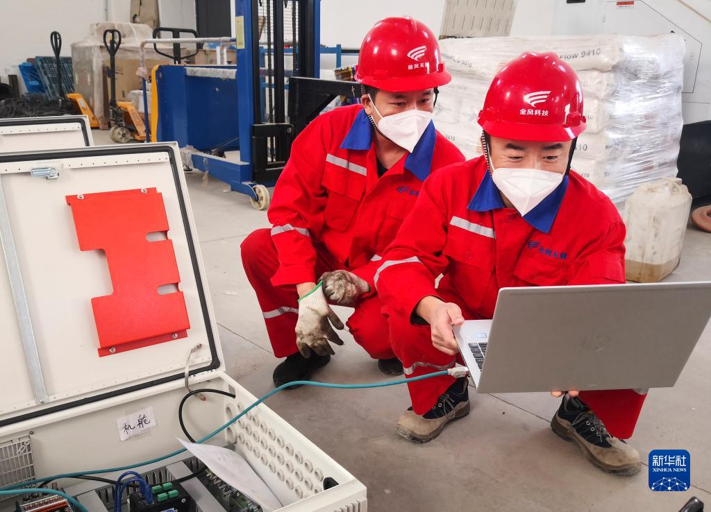 10月16日,在新疆烏魯木齊金風(fēng)科技天翼達(dá)坂城試驗風(fēng)電場,場長張新旺(右)和同事一起工作。新華社發(fā)(周凱 攝)