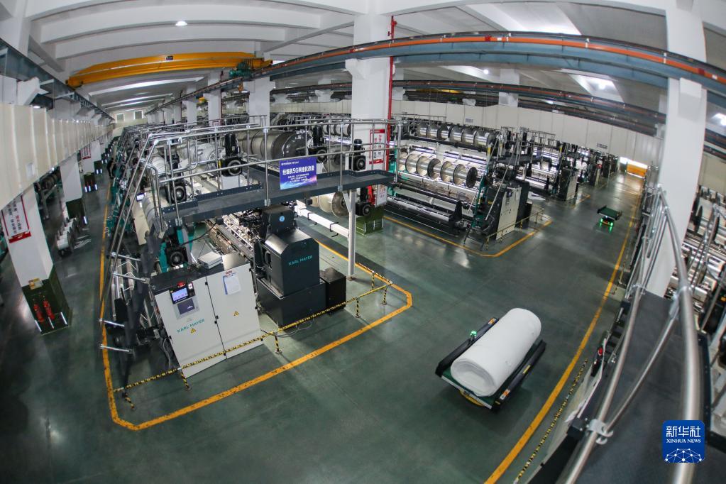 福建晉江,華宇錚鎣集團(tuán)第五經(jīng)編車間內(nèi),一排排經(jīng)編機(jī)正在高速運轉(zhuǎn),AGV物流機(jī)器人不停穿梭其中。