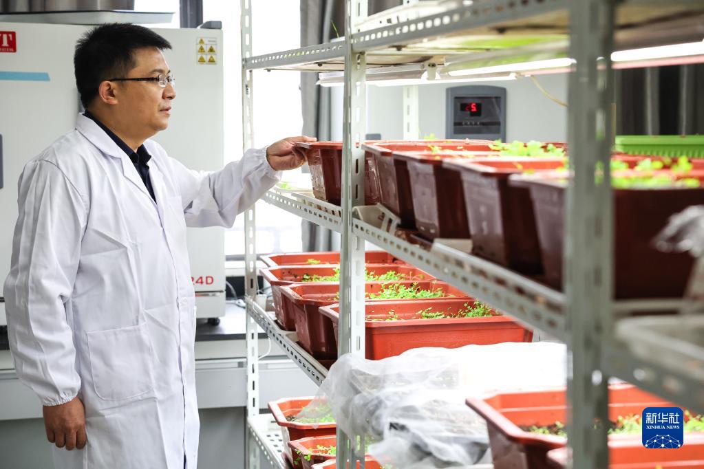 10月20日,貴州大學(xué)動物科學(xué)學(xué)院院長陳超在實驗室內(nèi)觀察新品種牧草的生長情況。新華社記者 歐東衢 攝
