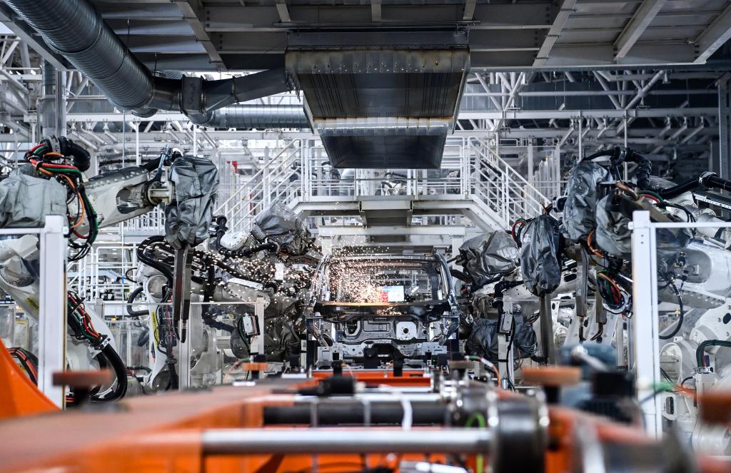 10月17日,在吉林長春中國第一汽車集團(tuán)有限公司紅旗繁榮工廠焊裝車間內(nèi),焊裝機(jī)器人在生產(chǎn)線上焊接車身。新華社記者 顏麟蘊(yùn) 攝