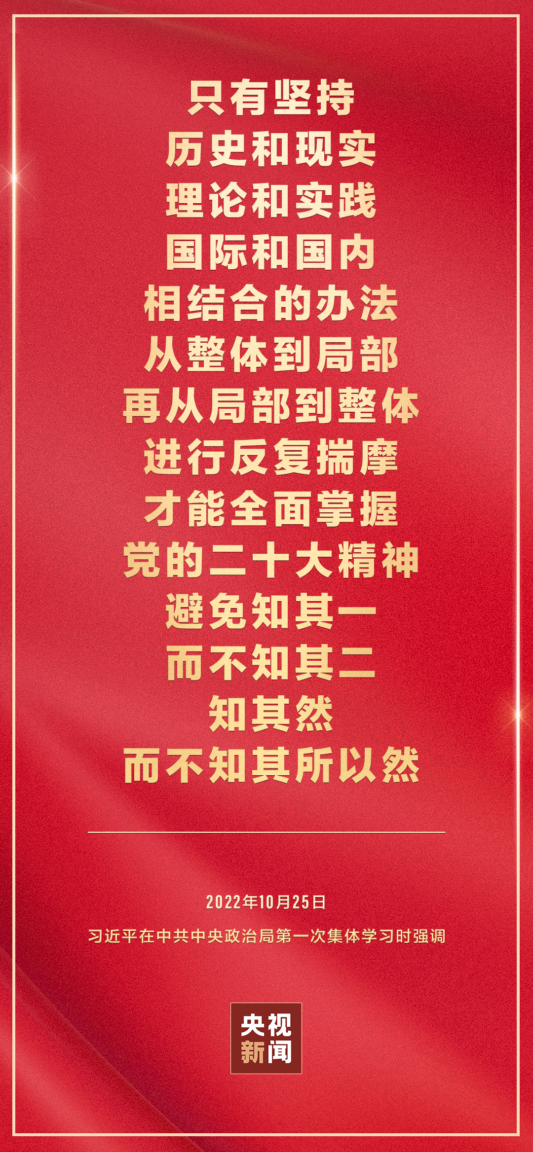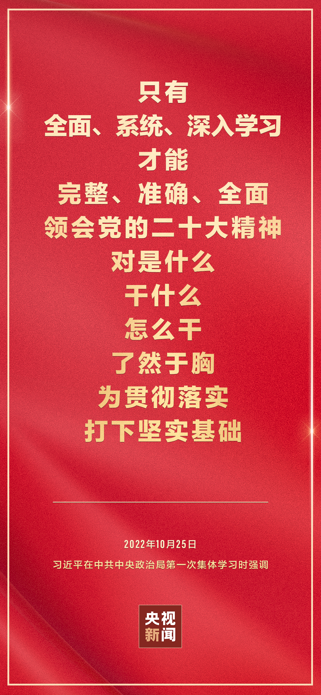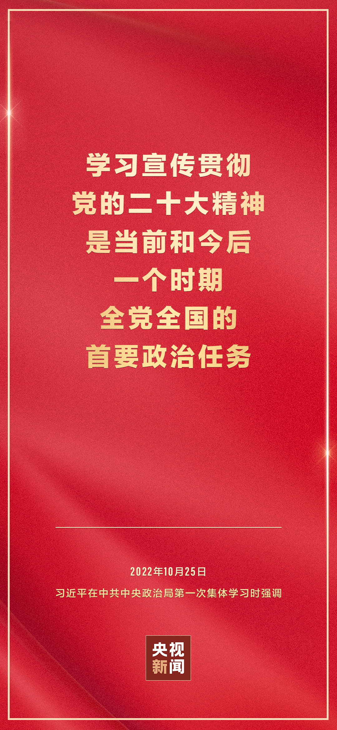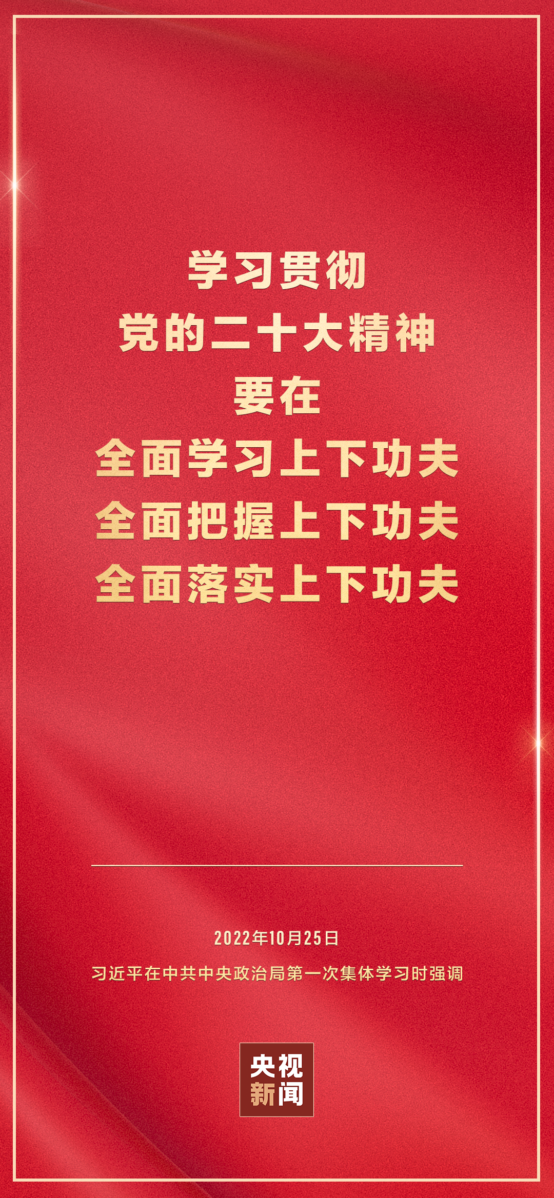 二十屆中共中央政治局10月25日下午就學(xué)習(xí)貫徹黨的二十大精神進(jìn)行第一次集體學(xué)習(xí)。中共中央總書(shū)記習(xí)近平在主持學(xué)習(xí)時(shí)強(qiáng)調(diào),全黨要在全面學(xué)習(xí)、全面把握、全面落實(shí)上下功夫,堅(jiān)定不移把黨的二十大提出的目標(biāo)任務(wù)落到實(shí)處,奮力奪取全面建設(shè)社會(huì)主義現(xiàn)代化國(guó)家新勝利。