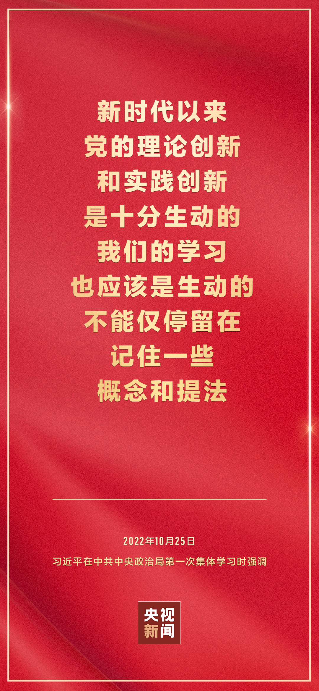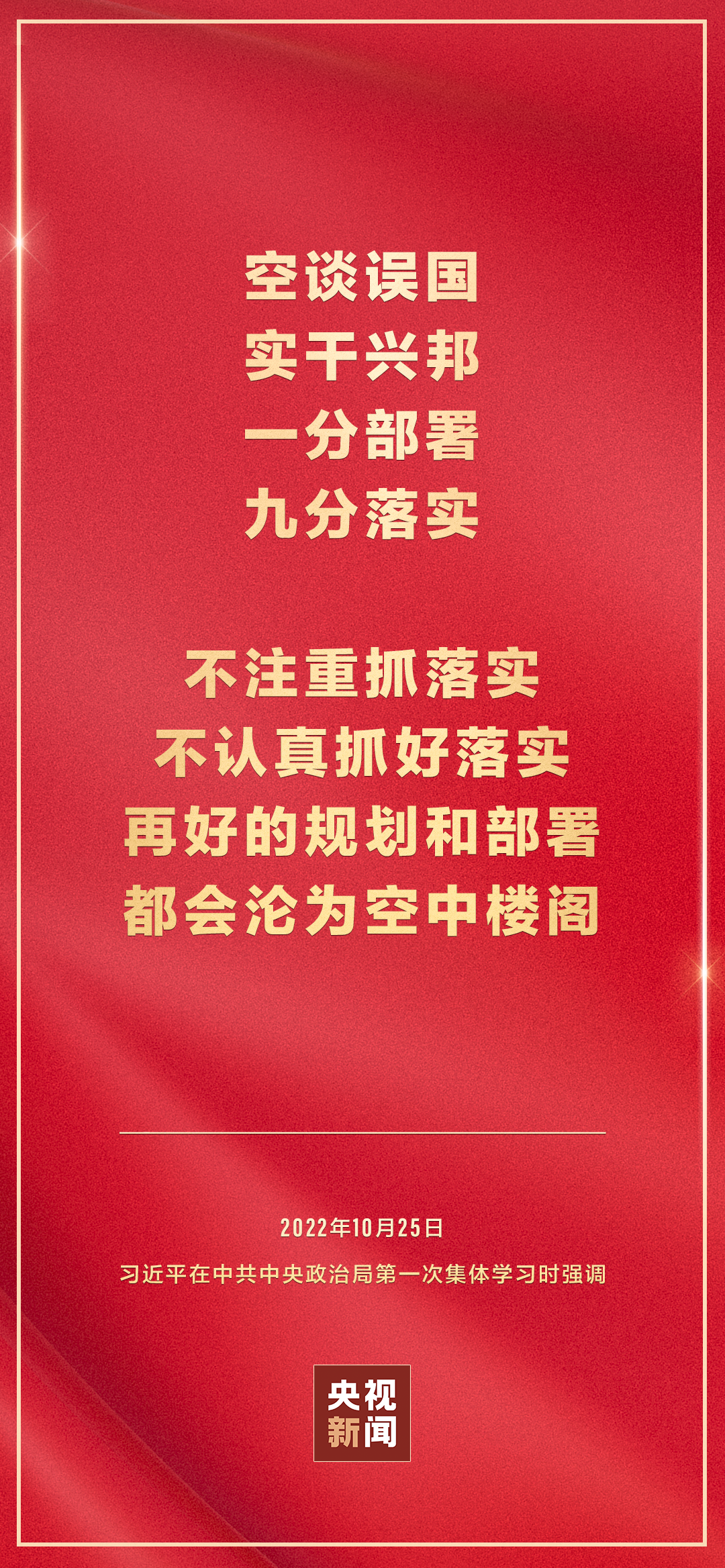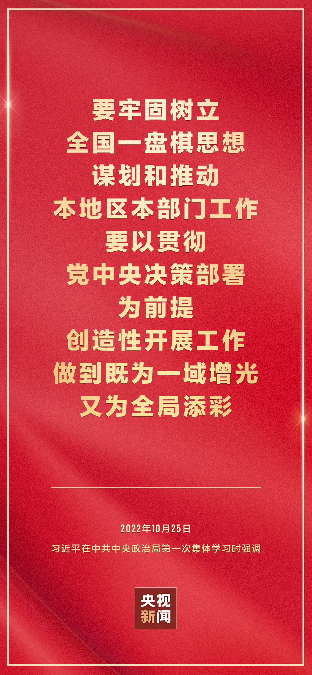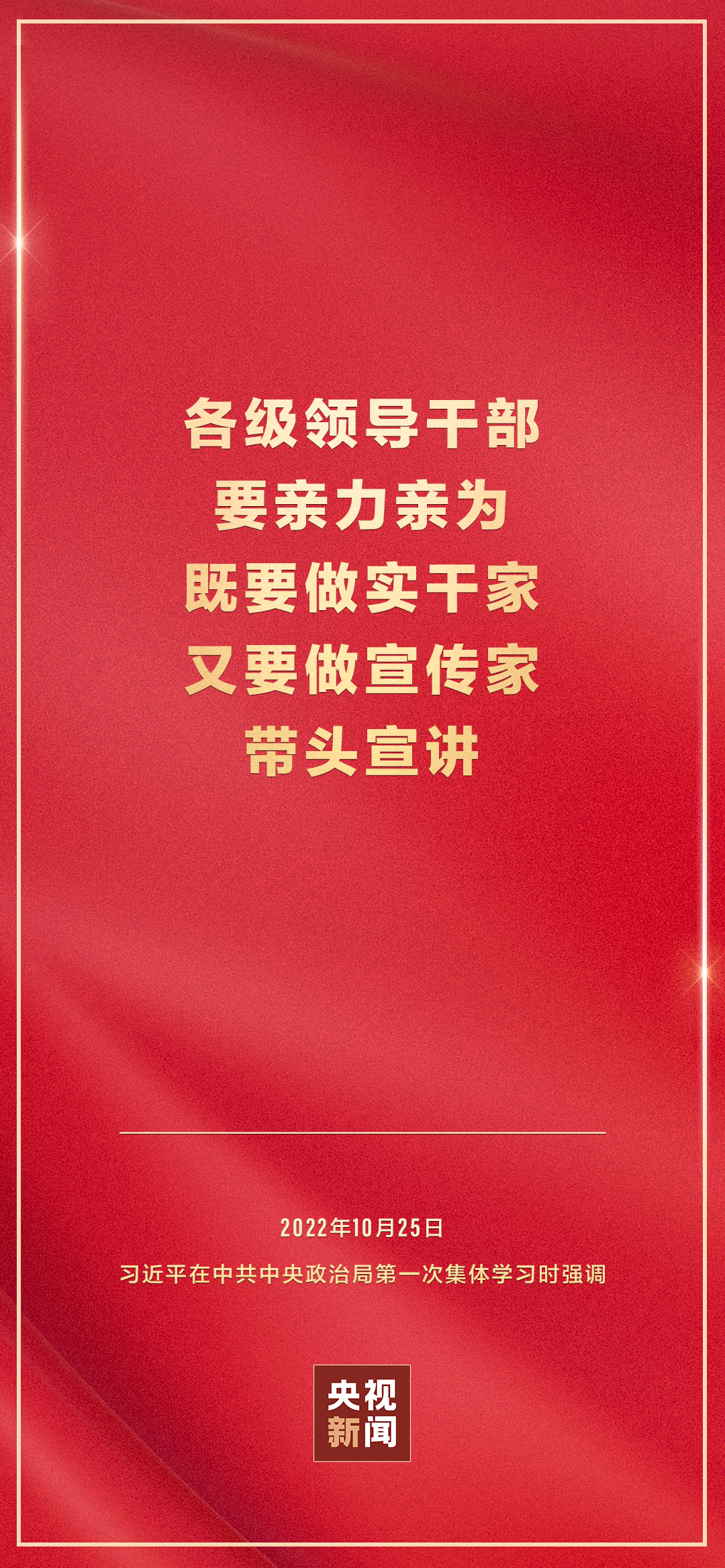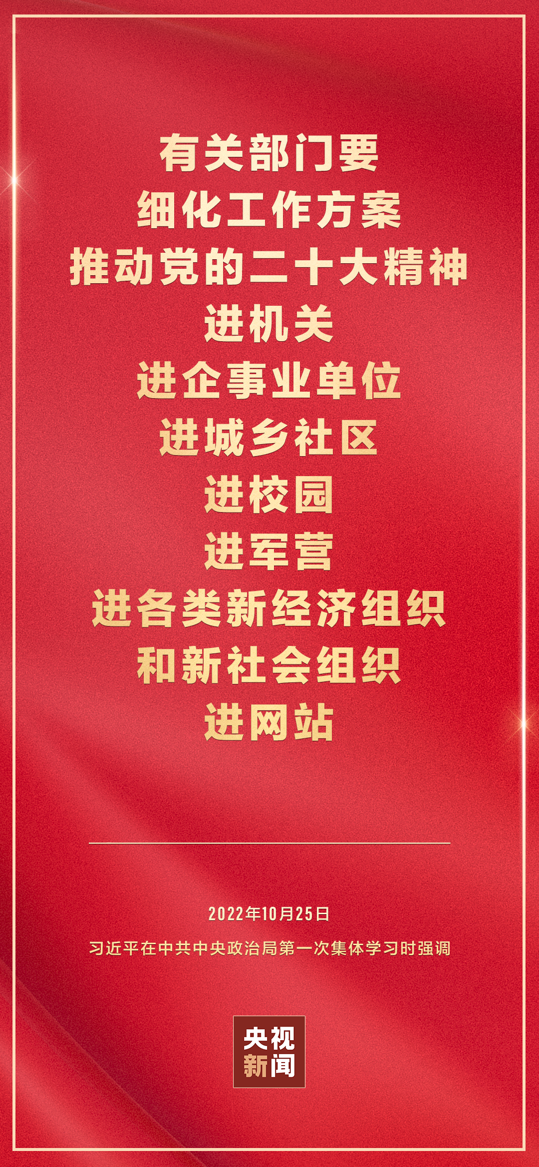 二十屆中共中央政治局10月25日下午就學(xué)習(xí)貫徹黨的二十大精神進(jìn)行第一次集體學(xué)習(xí)。中共中央總書(shū)記習(xí)近平在主持學(xué)習(xí)時(shí)強(qiáng)調(diào),全黨要在全面學(xué)習(xí)、全面把握、全面落實(shí)上下功夫,堅(jiān)定不移把黨的二十大提出的目標(biāo)任務(wù)落到實(shí)處,奮力奪取全面建設(shè)社會(huì)主義現(xiàn)代化國(guó)家新勝利。