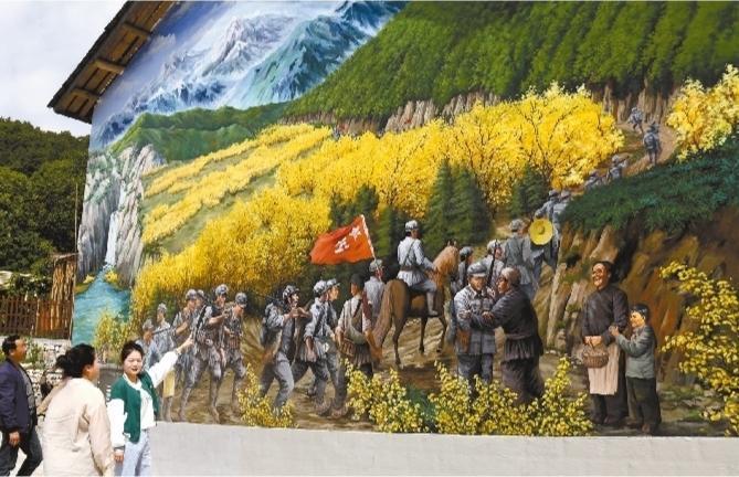 佛坪縣長(zhǎng)角壩鎮(zhèn)沙窩村講解員站在大型墻畫前向游客講述紅軍長(zhǎng)征駐扎沙窩村的故事。 通訊員 吳彥峰攝