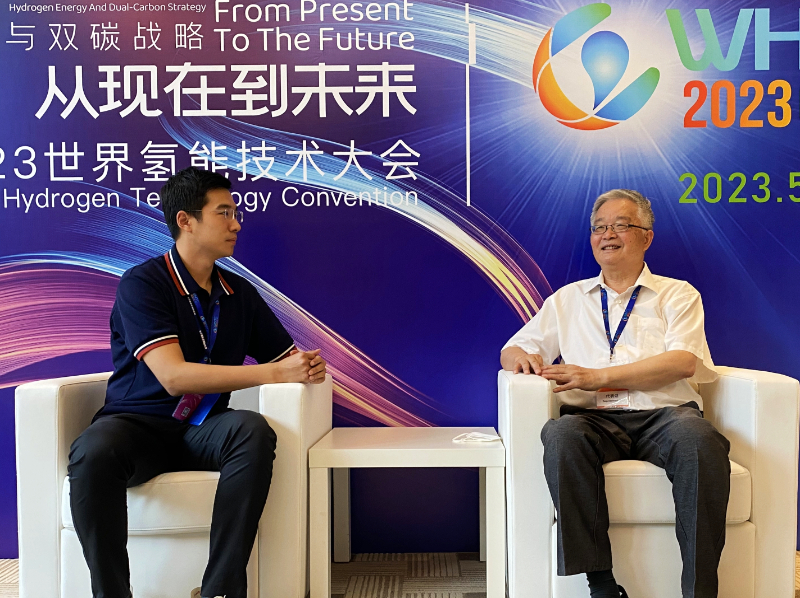 圖為國際氫能協(xié)會(huì)副主席毛宗強(qiáng)(右)接受新華網(wǎng)采訪