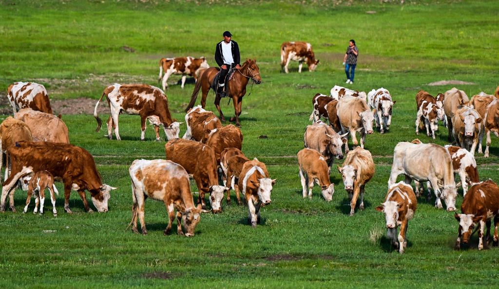 6月16日,格日樂朝格圖在趕牛。新華社記者連振 攝