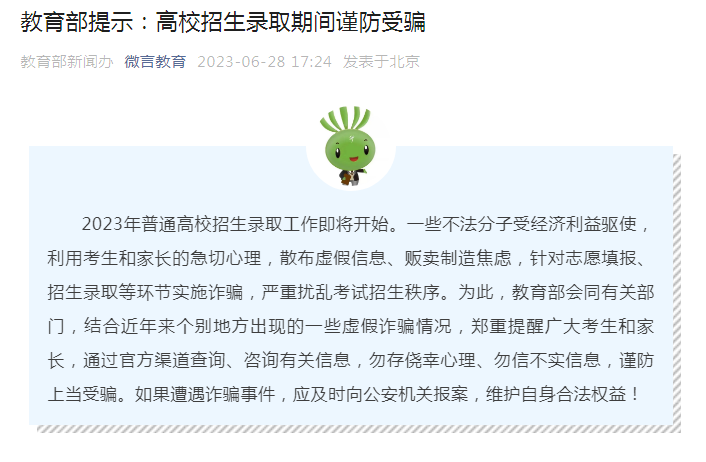 2023年普通高校招生錄取工作即將開始。教育部會(huì)同有關(guān)部門,結(jié)合近年來(lái)個(gè)別地方出現(xiàn)的一些虛假詐騙情況,鄭重提醒廣大考生和家長(zhǎng),通過(guò)官方渠道查詢、咨詢有關(guān)信息,勿存僥幸心理、勿信不實(shí)信息,謹(jǐn)防上當(dāng)受騙。