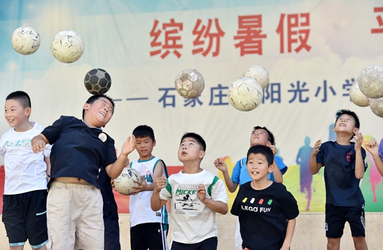 暑假期間,為減輕家長負擔,有效緩解學(xué)生暑期“看護難”問題,部分學(xué)校、社區(qū)開展暑期免費托管,為學(xué)生提供作業(yè)輔導(dǎo)和素質(zhì)課程等服務(wù),讓孩子們度過一個快樂、有意義的假期。 圖為7月10日,在石家莊市陽光小學(xué),學(xué)生進行足球訓(xùn)練。張曉峰/攝(新華社發(fā))