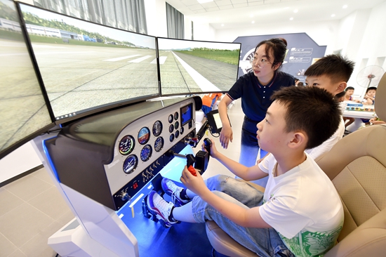 7月10日,在石家莊市融創(chuàng)中心第一小學(xué),學(xué)生在老師的指導(dǎo)下進行飛行模擬駕駛。張曉峰/攝(新華社發(fā))