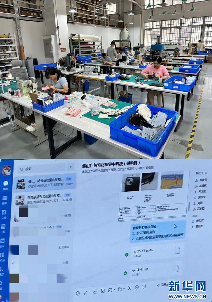 上圖為Custype手機(jī)殼打樣工廠;下圖為雯中科技搭建的采購群。新華網(wǎng) 關(guān)錦恒 攝