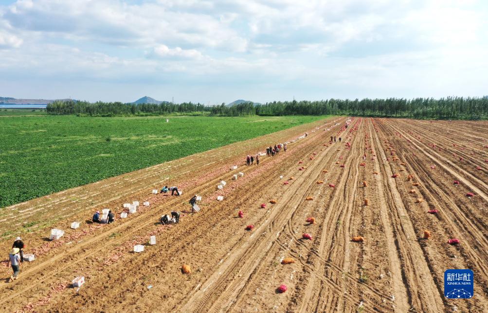 8月28日,灤州市九百戶鎮(zhèn)一家鮮食紅薯種植合作社的社員在田間收獲煙薯(無人機照片)。