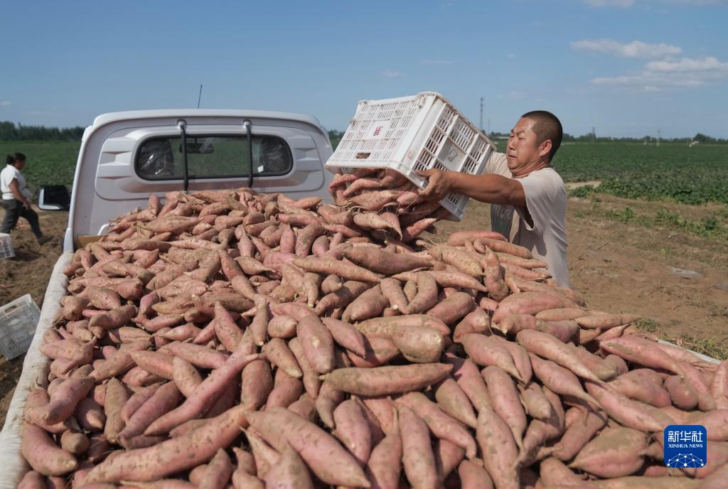8月28日,灤州市九百戶鎮(zhèn)一家鮮食紅薯種植合作社的社員在將收獲的煙薯裝車。