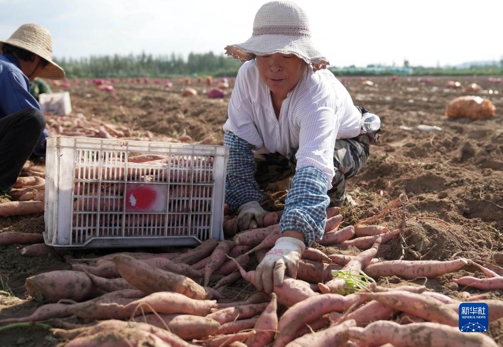 8月28日,灤州市九百戶鎮(zhèn)一家鮮食紅薯種植合作社的社員在田間收獲煙薯。