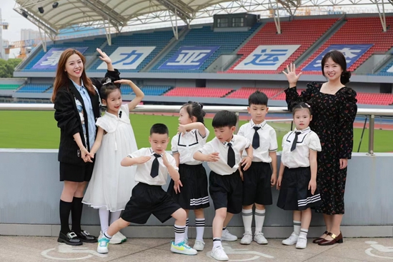 浙江省杭州市丁信幼兒園教師徐元鳳(右一)與孩子們一起迎亞運。受訪者供圖