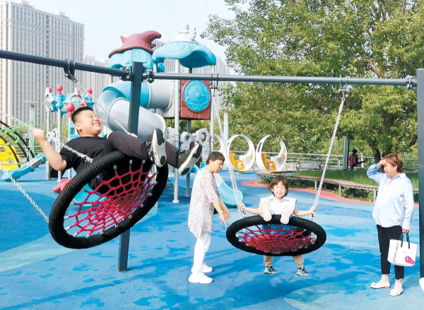 初秋,在亦莊涼水河公園,孩子們暢玩輪胎秋千。近年來,本市不少公園經過改造提升,新增了滑索、繩網等新設施,變得更加“兒童友好”。 記者 甘南攝