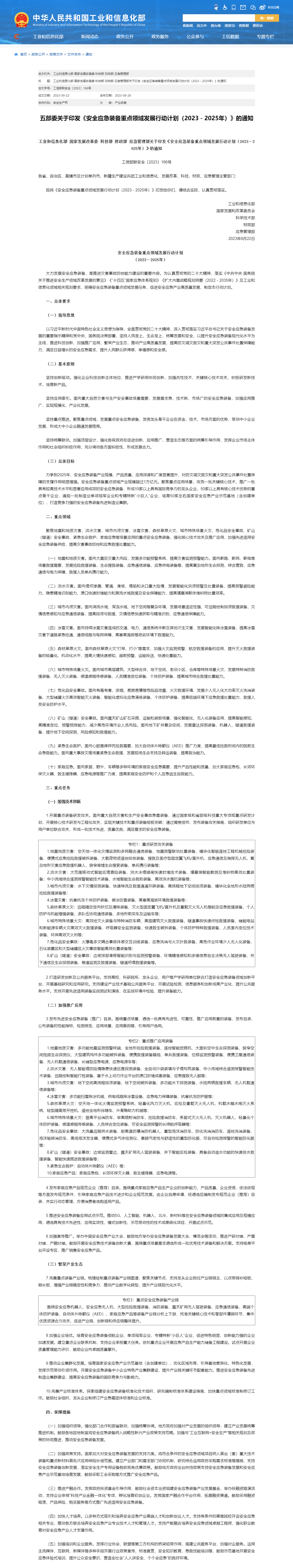 工信部官網(wǎng)消息,近日,工業(yè)和信息化部、國家發(fā)展改革委、科技部、財政部、應(yīng)急管理部等五部門聯(lián)合印發(fā)《安全應(yīng)急裝備重點領(lǐng)域發(fā)展行動計劃(2023-2025年)》。其中提出,力爭到2025年,安全應(yīng)急裝備產(chǎn)業(yè)規(guī)模、產(chǎn)品質(zhì)量、應(yīng)用深度和廣度顯著提升,對防災(zāi)減災(zāi)救災(zāi)和重大突發(fā)公共事件處置保障的支撐作用明顯增強。安全應(yīng)急裝備重點領(lǐng)域產(chǎn)業(yè)規(guī)模超過1萬億元。聚焦重點應(yīng)用場景,攻克一批關(guān)鍵核心技術(shù),推廣一批具有較高技術(shù)水平和顯著應(yīng)用成效的安全應(yīng)急裝備,形成10家以上具有國際競爭力的龍頭企業(yè)、50家以上具有核心技術(shù)優(yōu)勢的重點骨干企業(yè),涌現(xiàn)一批制造業(yè)單項冠軍企業(yè)和專精特新“小巨人”企業(yè),培育50家左右國家安全應(yīng)急產(chǎn)業(yè)示范基地(含創(chuàng)建單位),打造競爭力強的安全應(yīng)急裝備先進制造業(yè)集群。