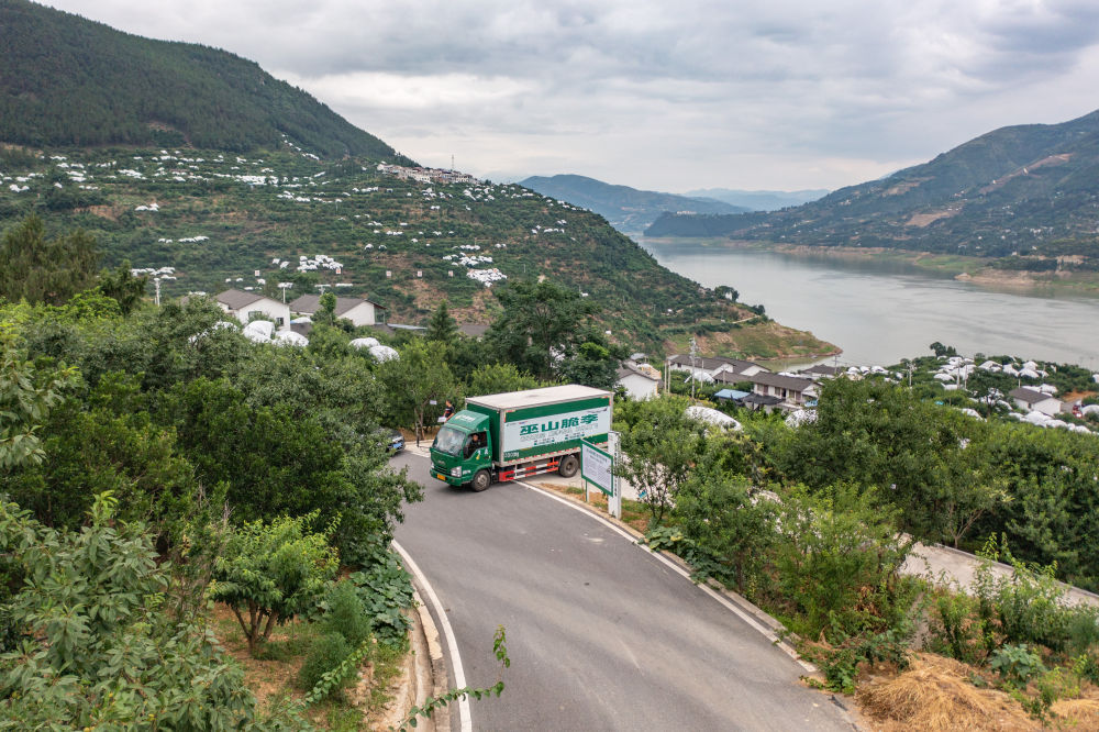 ↑重慶市巫山縣曲尺鄉(xiāng)柑園村,裝載有巫山脆李的中國(guó)郵政物流車行駛在村內(nèi)(無(wú)人機(jī)照片,6月28日攝)。過(guò)去因?yàn)槲锪鞑槐悖?jīng)過(guò)幾天的運(yùn)輸后,脆李的品質(zhì)和口感會(huì)受到影響?,F(xiàn)在,航空快遞的開(kāi)通,讓巫山脆李快速走向全國(guó)。