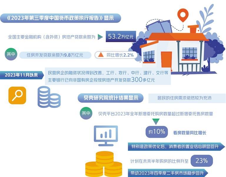 從銀行信貸角度看,房地產(chǎn)信貸融資的規(guī)模、結(jié)構(gòu)整體穩(wěn)定?!?023年第三季度中國貨幣政策執(zhí)行報(bào)告》顯示,全國主要金融機(jī)構(gòu)(含外資)房地產(chǎn)貸款余額為53.2萬億元,其中,住房開發(fā)貸款余額為9.8萬億元,同比增長2.2%。2023年11月以來,民營房企的融資狀況得到改善,工行、農(nóng)行、中行、建行、交行等主要銀行已向非國有房企投放房地產(chǎn)開發(fā)貸款300多億元。