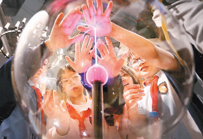 學(xué)生們在廣東科學(xué)中心觀察和體驗“輝光球”放電現(xiàn)象。黃繼明攝(人民圖片)