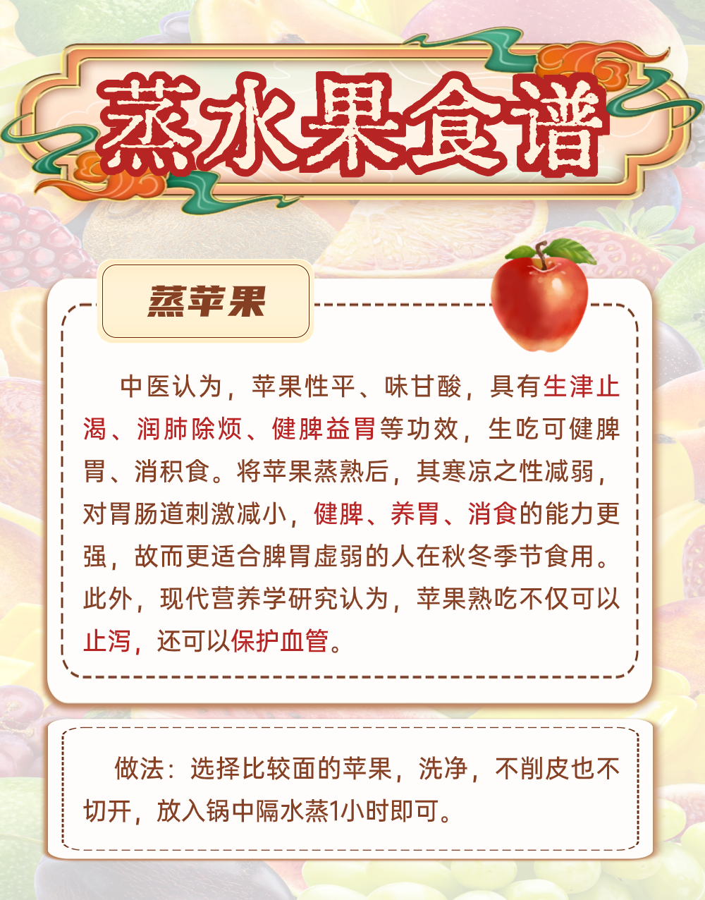 那么,應該怎樣蒸水果呢?不同水果蒸著吃,對健康有哪些好處呢?請收好這份蒸水果食譜。(記者 雷妍 實習記者 王佳路)