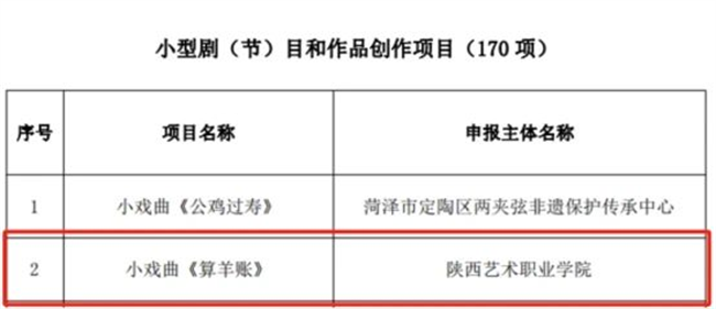 西部決策網(wǎng)訊(記者劉玉 韓宗憲 通訊員 吳卉)近日,國家藝術(shù)基金管理中心公布了《國家藝術(shù)基金(一般項目)2024年度資助項目公示名單》,陜西藝術(shù)職業(yè)學(xué)院教師彭馨韻申報的小戲曲《算羊賬》獲批舞臺藝術(shù)創(chuàng)作資助項目(小型?。ü?jié))目和作品創(chuàng)作項目)。