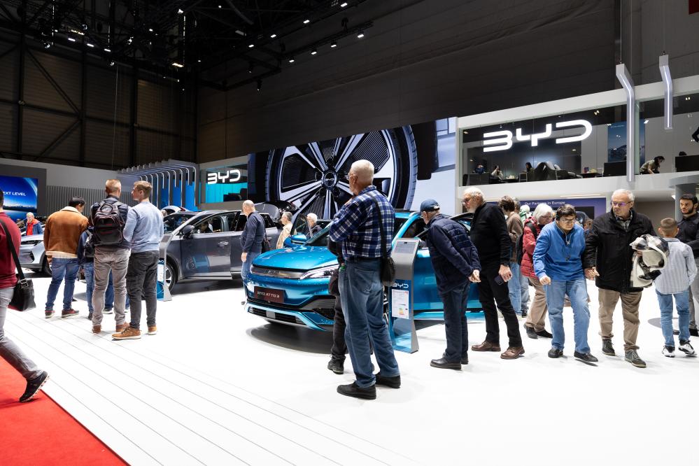 這是2月28日在瑞士日內瓦舉行的2024年日內瓦國際車展上拍攝的比亞迪展臺。新華社記者孟鼎博 攝