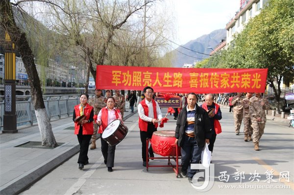 “喜報見證的是軍人至高無上的榮譽,大張旗鼓地開展送喜報活動,決不讓軍人的成績和榮譽只停留在檔案袋里,在更大范圍彰顯‘榮譽感’、擴大‘感召圈’,用實際行動使關(guān)心國防、熱愛國防、建設(shè)國防、保衛(wèi)國防成為全社會的思想共識和自覺行動。”鎮(zhèn)巴縣退役軍人事務(wù)局負責人鏗鏘有力的發(fā)言贏得了廣大軍民雷鳴般的掌聲。
