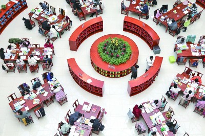 學(xué)生們?cè)诒本┩鈬Z大學(xué)圖書館內(nèi)閱讀。新華社發(fā)