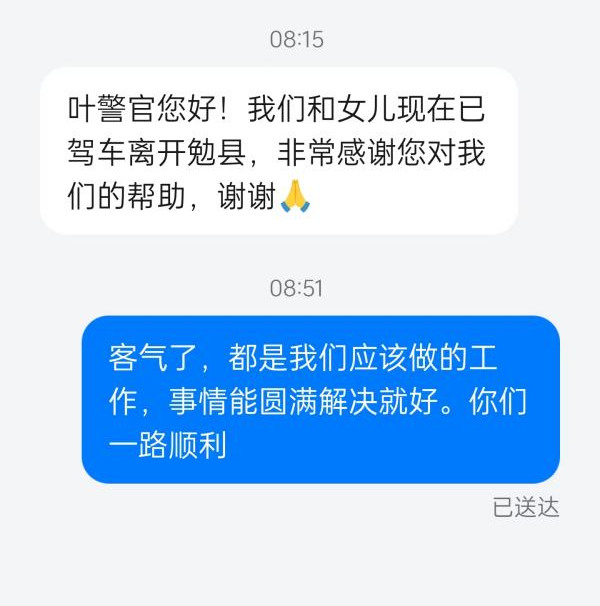經(jīng)詢問,兩人是貴州貴陽人,其女兒饒某因家庭矛盾離家出走勉縣尋找網(wǎng)友嚴某,至今已失聯(lián)半個月。夫妻倆心急如焚,駕車從貴陽趕到勉縣,由于人生地不熟,便想到派出所尋求幫助。了解情況后,接警民警及時將指令下達給社區(qū)民警。社區(qū)民警會同警務(wù)助理及社區(qū)工作人員開展尋人工作,經(jīng)過不懈努力,終于在嚴某租住的民房內(nèi)找到饒某,并將其帶回派出所。